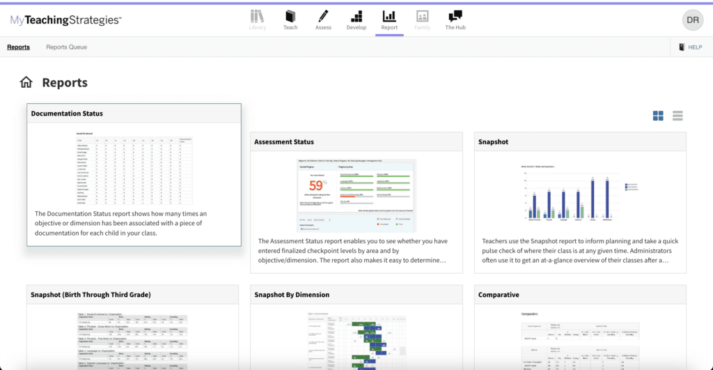 In addition to the insight enhancements described above (Documentation Counts—At-a-Glance; Alphabet Knowledge, Number Concepts, and Shapes forms; new KEA enhancements; and ReadyRosie + The Creative Curriculum Cloud – Limited Beta), the new Reports landing page will set the stage for improved reporting in the future.