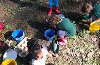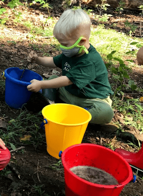 During the mud experience, children, especially younger children, may engage in the same act repeatedly as they fill, dump, and transfer buckets of mud. Embrace this repetition, as children are practicing essential cognitive and math skills such as persistence and early measurement skills.