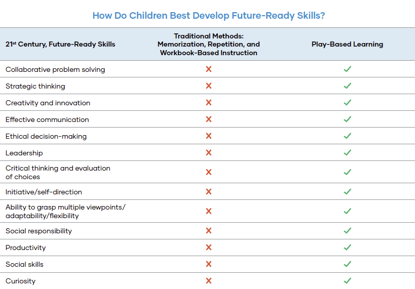 The power of play has been researched and validated many times over. A consistent finding is that, through play-based learning, children develop deep understandings of complex concepts—including cognitive constructs known as 21st century skills—in ways that are not possible through traditional academic, teacher-directed instruction, worksheets, and flashcards.