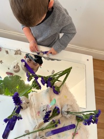 Provide time and space for children to freely test their ideas and go with the flow. It is in these moments, when adults respond by allowing children to decide what to do, listening to their decisions and thought processes, and following their lead, that growth and learning evolve for both the child and the adult. When exploring materials and observing play alongside children, consciously avoid steering children’s play in one direction or another. If children require support, consider questions and comments such as “Can you tell me about how you are using the clay?” or “I wonder how you got that idea.” Open-ended questions encourage children to lean into their creative thinking and test out their ideas.