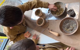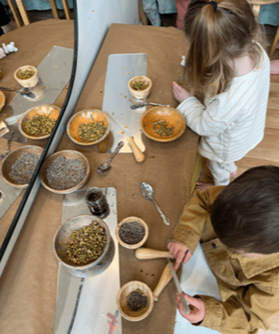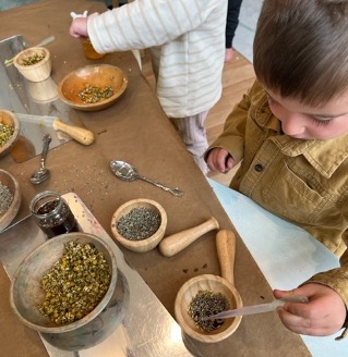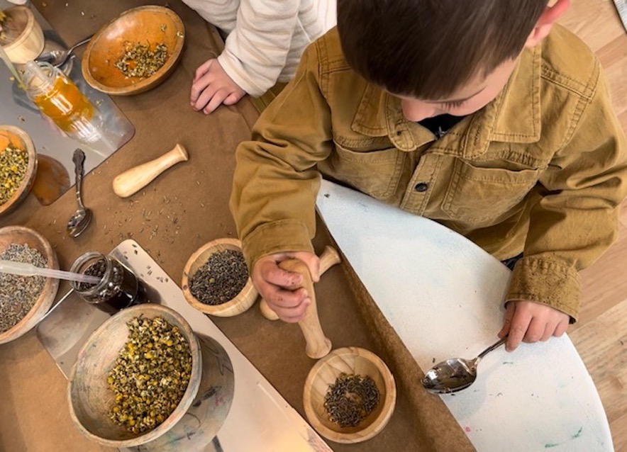 Lily and Ben, both of whom are about to turn three years old, work alongside each other using mortars and pestles to grind lavender and chamomile flowers which they select from a shared bowl in the center of the table. The sweet, floral fragrance fills the Discovery area as both children tinker with and grind the flowers. All is serene, self-directed, and focused—at least for a few brief minutes.