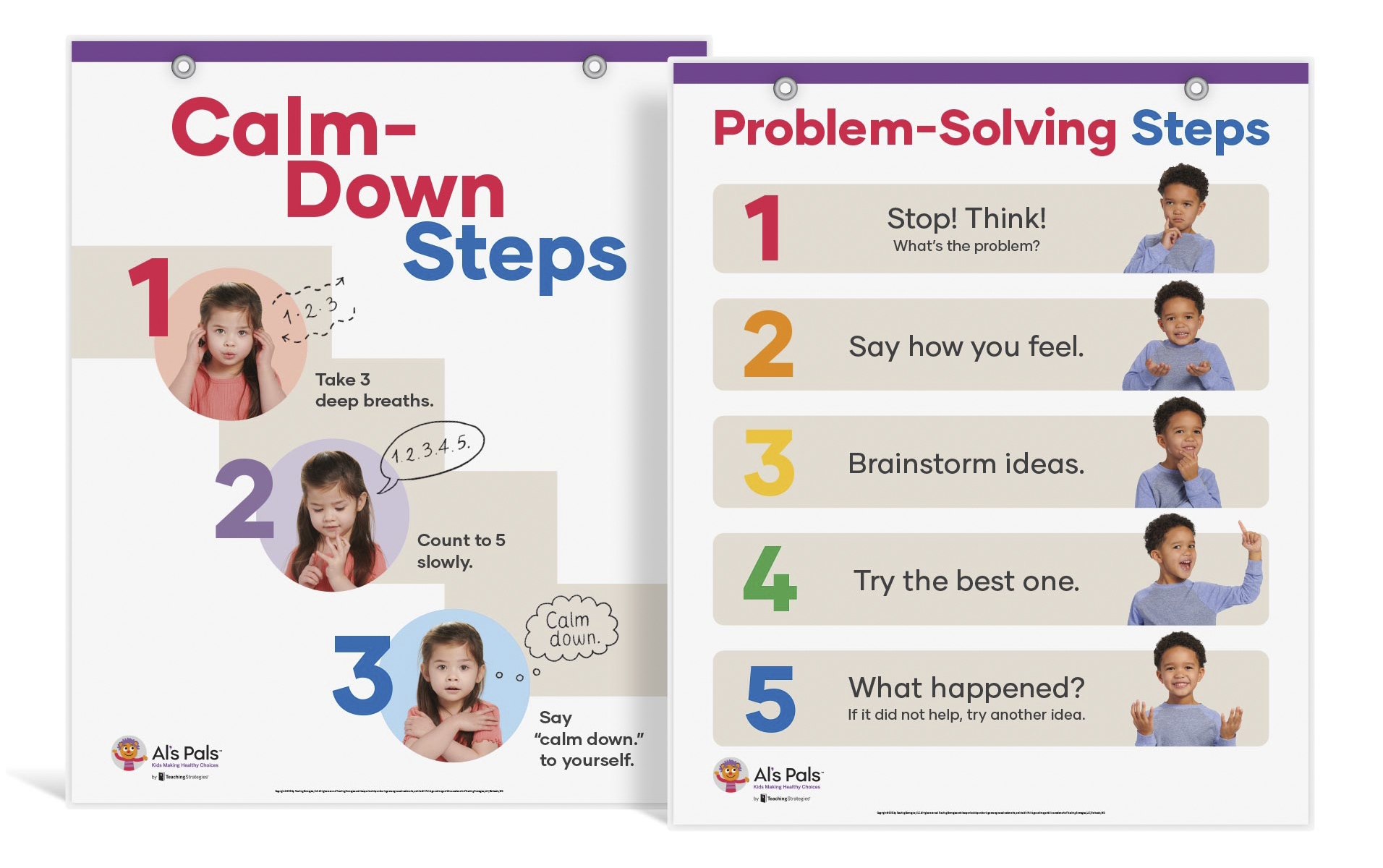 It is important to introduce social–emotional learning just as intentionally as literacy and mathematics learning! Display these posters in the large-group area or in the calm-down place. Whether used in a large group, small group, or one-on-one discussion, these posters can help you talk about managing emotions and calming down. Regularly practice using the problem-solving steps and talk about how doing so helps create a positive classroom community.